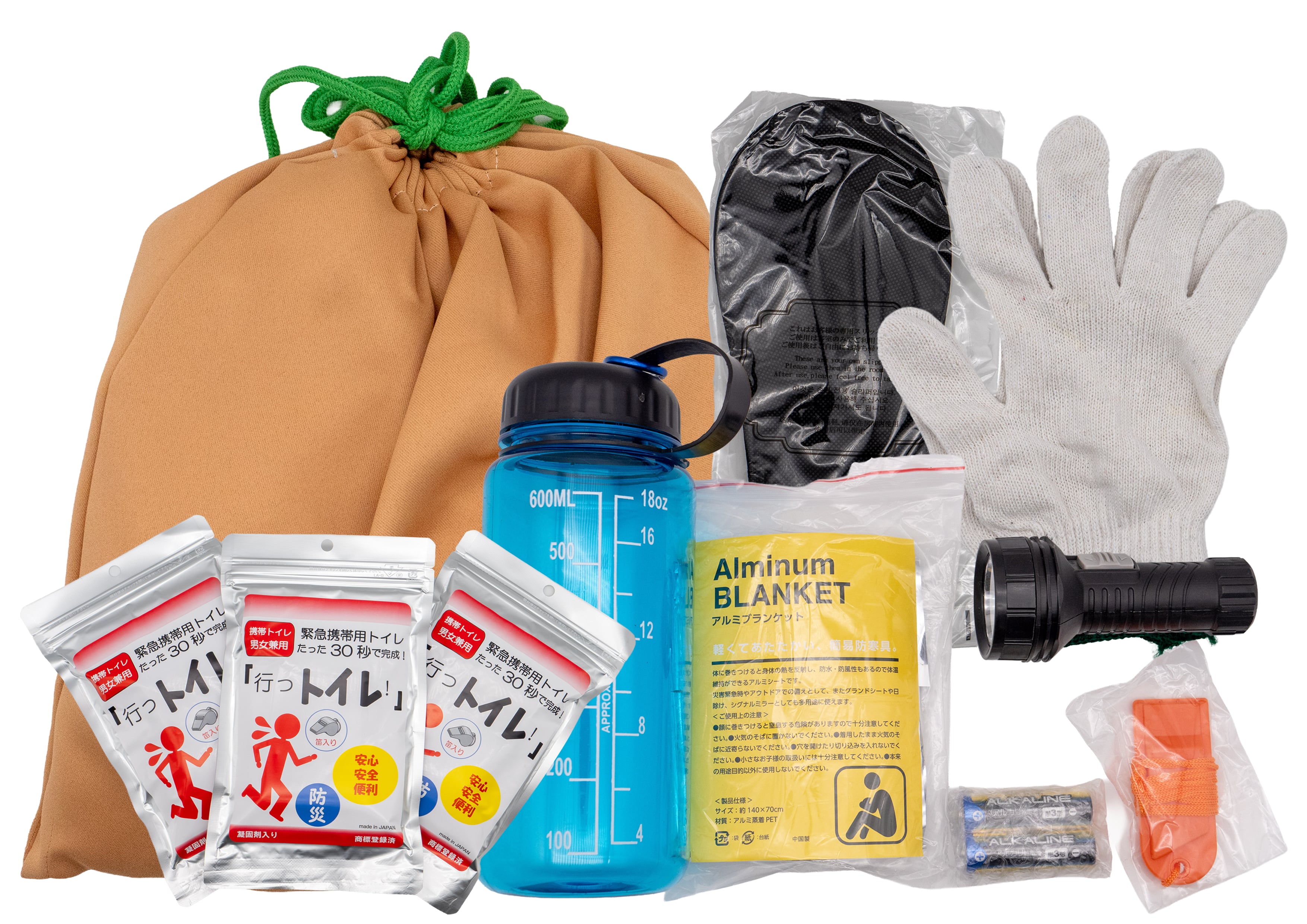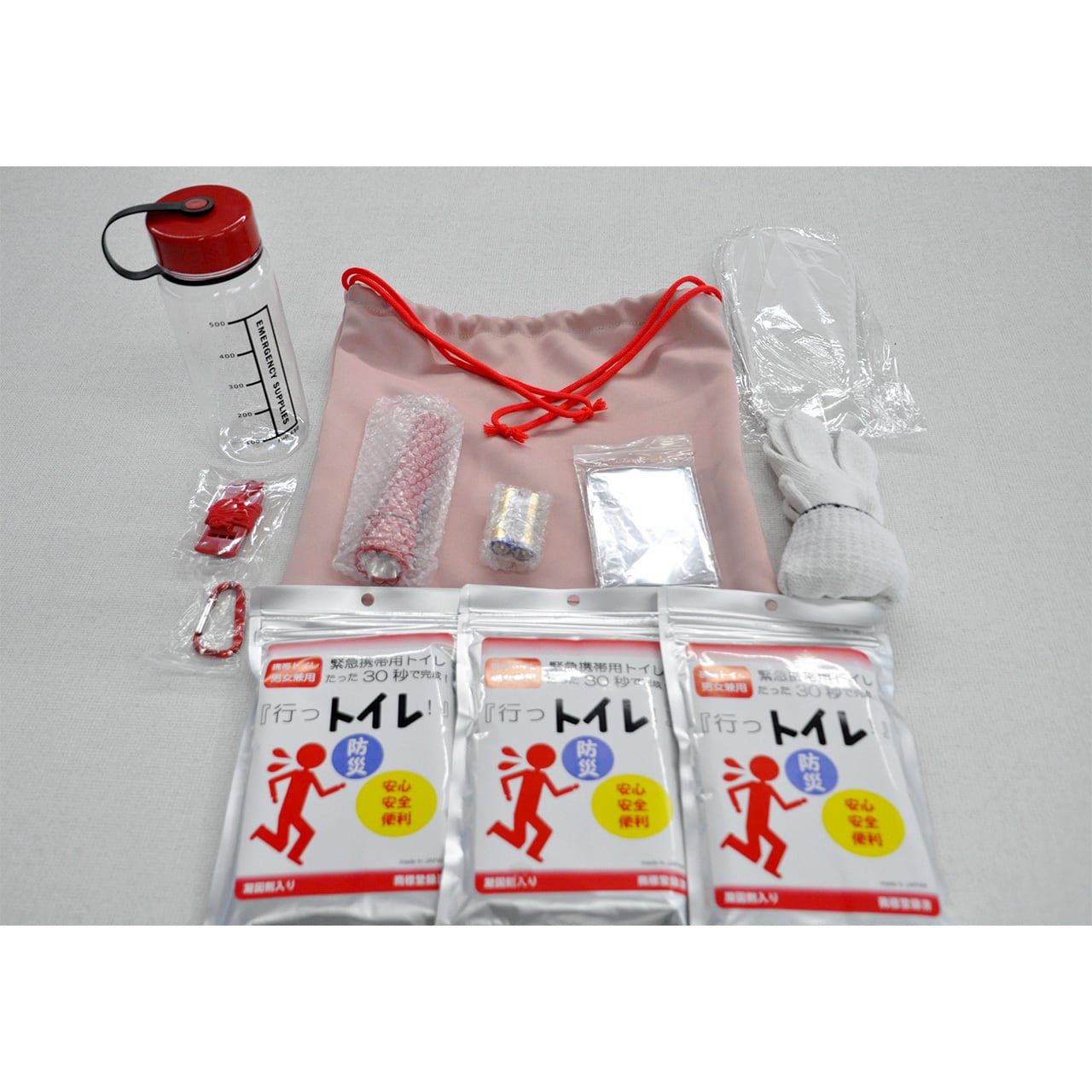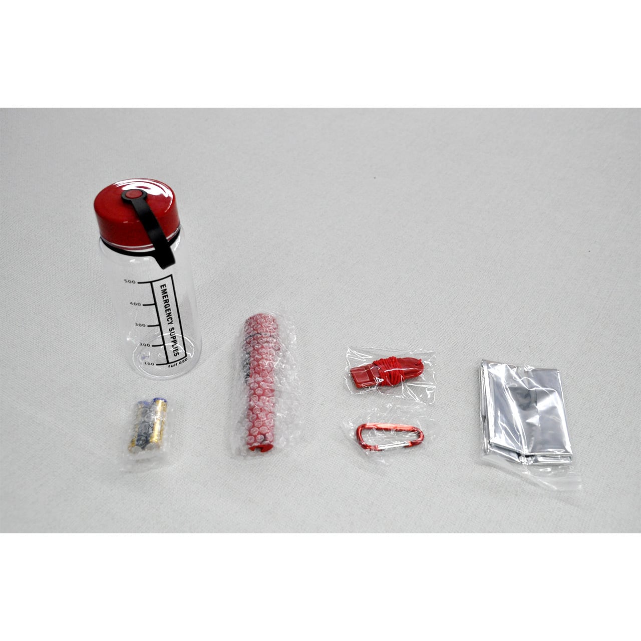 ・ウォーターボトルに 電池(2個/単三)、アルミブランケット、カラビナ、ライト、笛が収納されています。